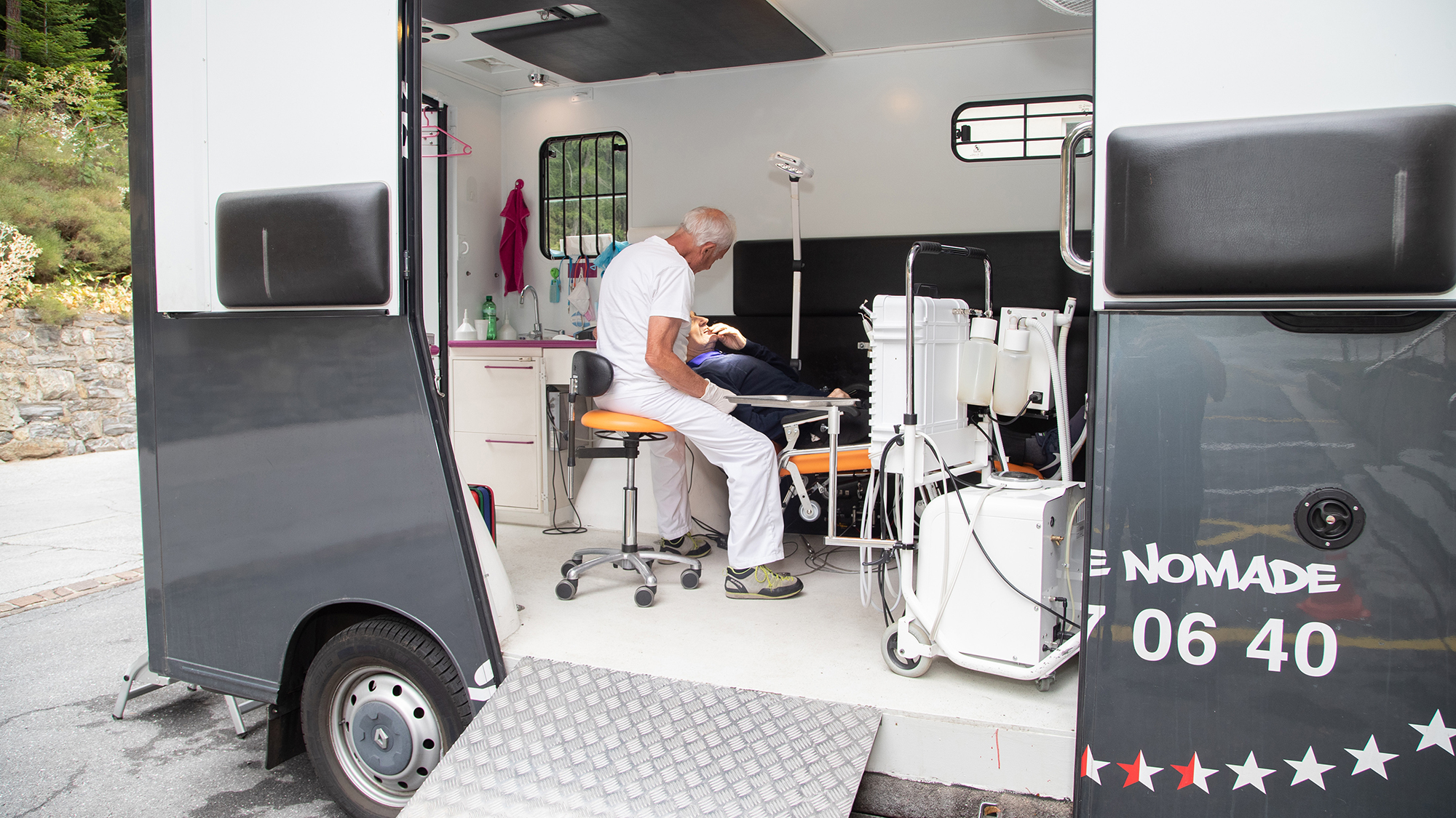 Grâce à son bus mobile, le Dr Berdj Haroutunian se rend plusieurs fois par année au home pour assurer les soins dentaires de nos résidents.
